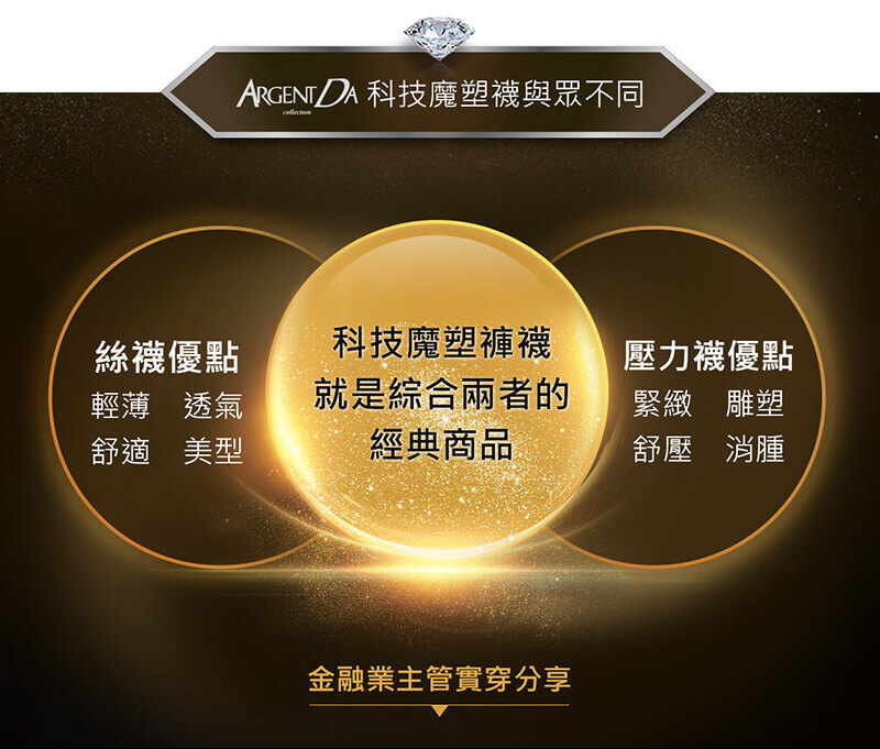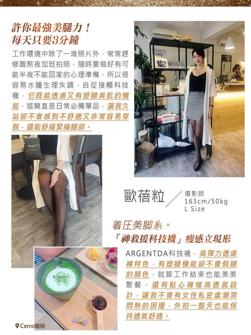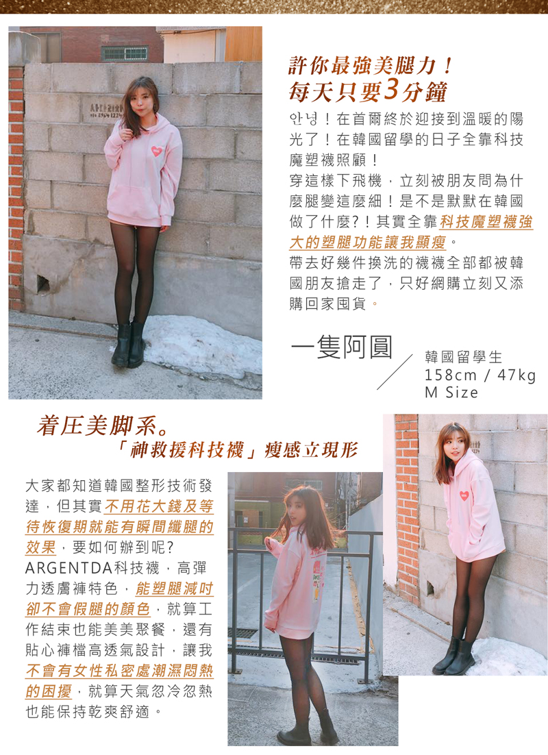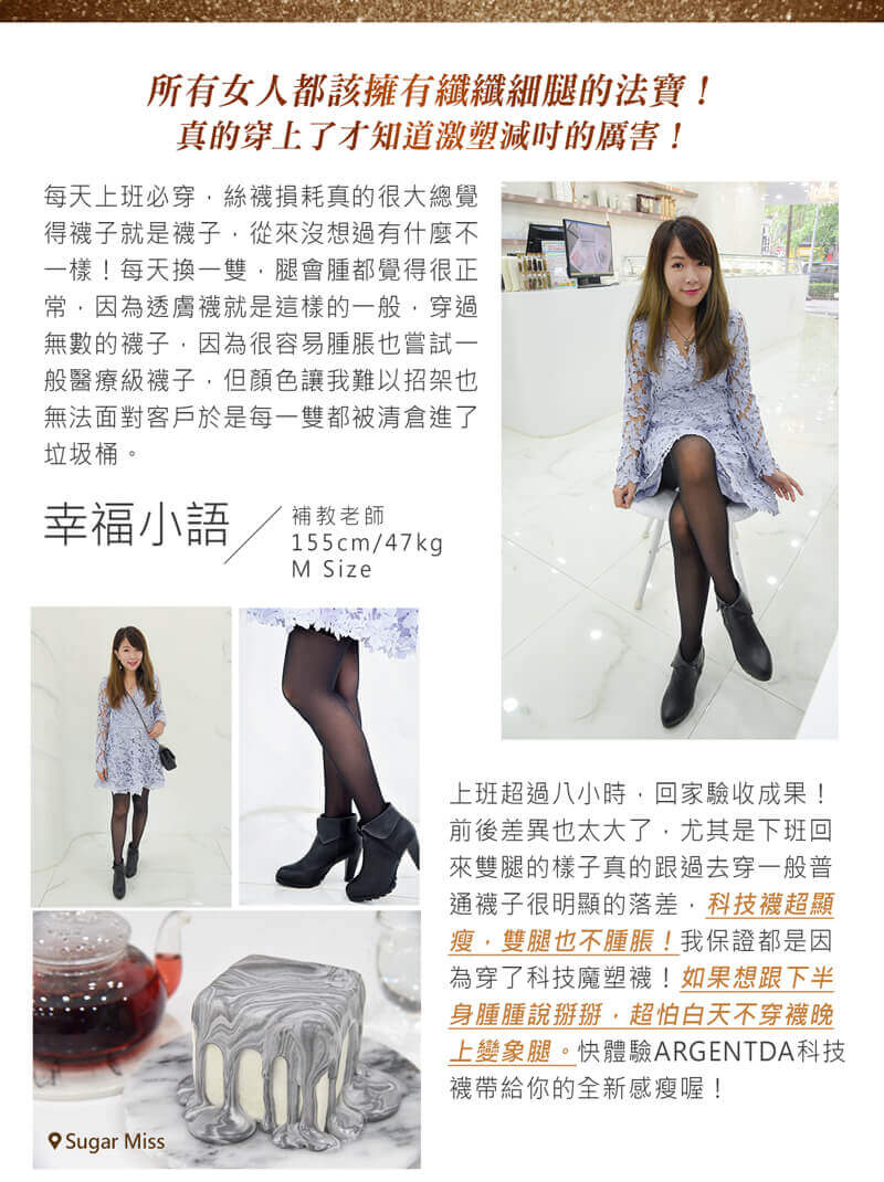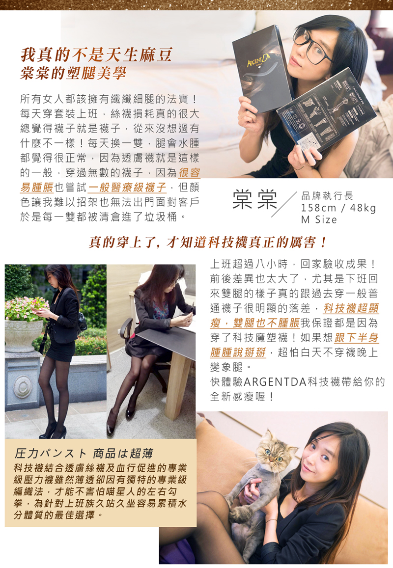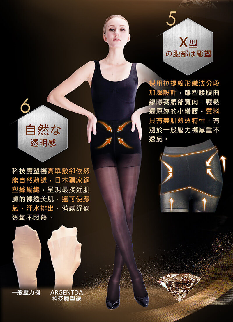 ARGENTDA科技魔塑襪,它的鋼絲材質真的好特別竟然都不容易勾絲,穿起來塑腿、提臀效果很好喔!連平時吃飽後凸出的小腹也能輕鬆擺平,同事都讚美我的腿變細而且有美肌效果!